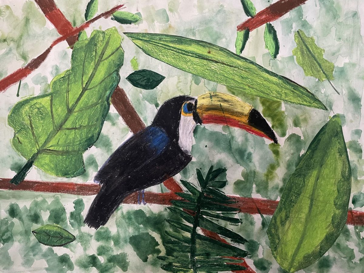 Artist Statement: This painting is watercolor on paper. It’s about friends, and the elephant is worried that her friends are making a joke about her. She’s running in the street, and there’s a person in the background who is happy because he had a good day. The Green Guy is singing “Hallelujah!” The clouds look happy. The bear is dressed up in pink the way I like. I like the rainbow road because it reminds me of Leprechauns who are tricky, and they like to fool people.