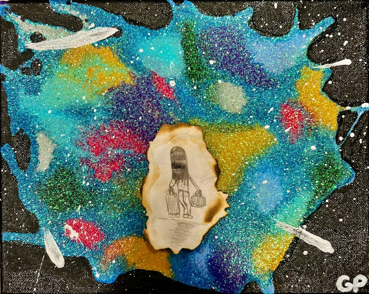 This piece captures a boy whose overflowing creativity bursts to life through the playful doodles spilling from his bag. The bold colors and expressive details reflect his imagination, blending reality with a world of fun and energy.