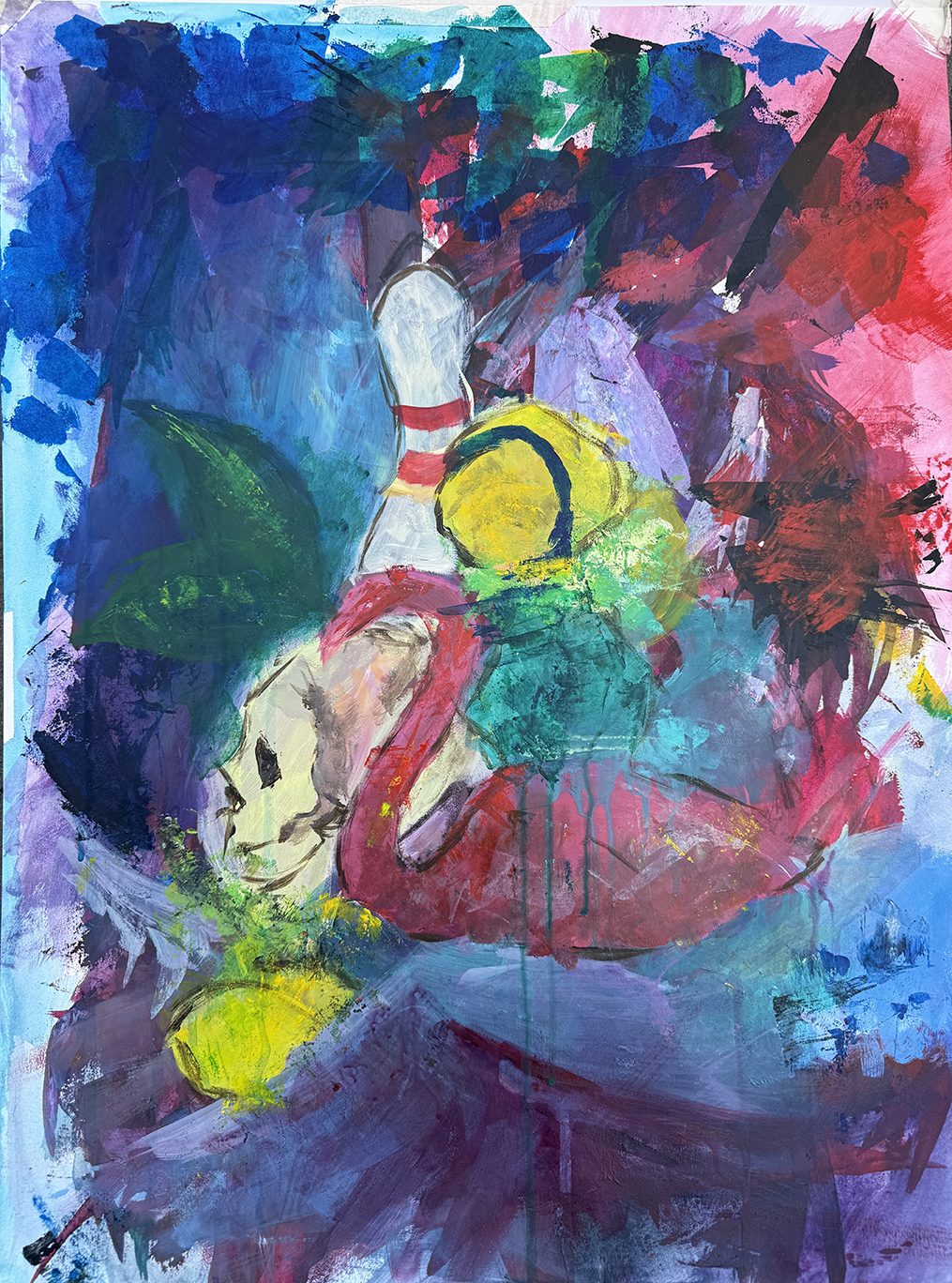 My work, “Still Life after Dark”, explores the connections between dreamscapes and reality, and questions our concepts of what we think is correct. Made by layering acrylics on paper, my goal is to lead the viewer to rethink how they see the objects around them. My composition brings life to the everyday and the ordinary, and I hope that observers draw their own conclusions about the depiction from what they know.