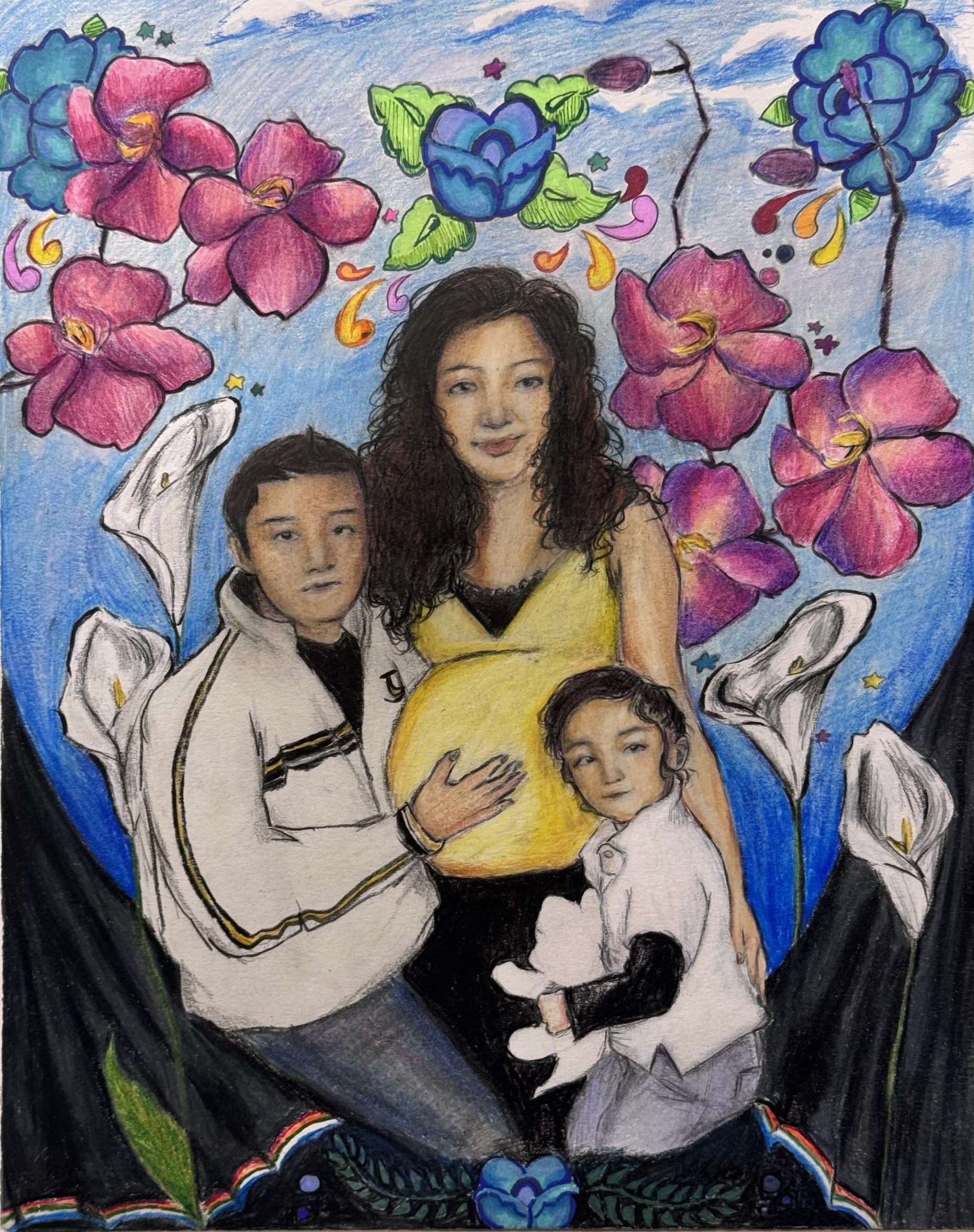In this drawing I used colored pencils and sharpie markers. The meaning of my artwork is to honor those who come before you it’s symbolic of family and traditional coming together. The people in this photo are my mom, dad, older sister, and me in my moms stomach. I was really inspired by Kehinde Wiley’s use of florals in his work.