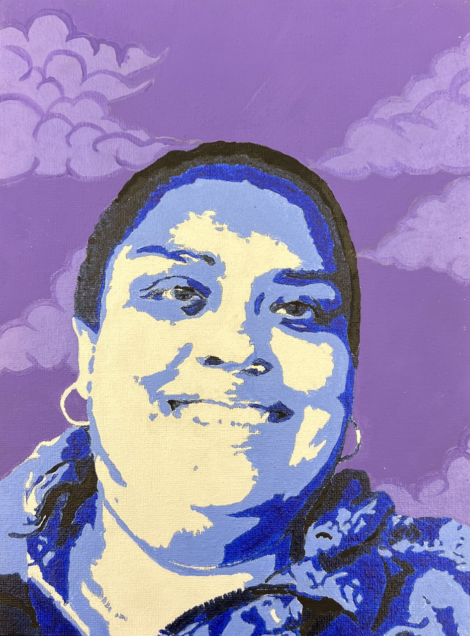 Description: In this piece, I started off light. As a child, a positive memory I’d shared with my mother was going to a cow farm and watching a baby calf birth in real time. To signify what was once but a simple, joyful memory corrupted by the tribulations I would encounter in later years, for this particular piece, I researched illnesses among cattle in relation to populous poisonings, and how they visually affect a cow’s wellbeing–jaundice in the eyes, discoloration of the muzzle, and ulcers on the tongue were symptoms that I found particular interest in and wanted to illustrate and encompass in the grimy overall mood of the painting.