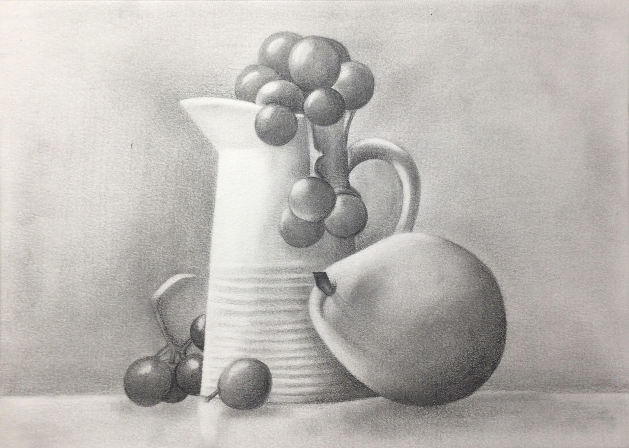 Artist Statement: In this art piece, I did my best to bring this drawing to life. Texture throughout the drawing can be seen giving it that sense of realism and the background was made lighter to allow the fruit and glass to stand out. I also made sure I captured every shadow that appeared and highlighted even in the smallest details, all to bring this drawing to life
