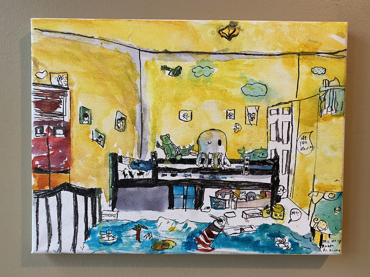 I drew my playroom with my three favorite stuffed animals! I love Towels, I mean my three favorite stuffed animals, who do what I really wanted them to. I love how I left white spaces on my painting.