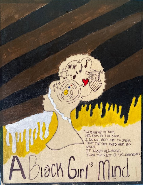 I created an artwork that captures the minds and emotions of black girls through the interpretation of a few. I did this by collecting information from friends and cousins. I added their everyday thoughts, feelings, and concerns. I used sharpie and paint to add images inside the girl’s “mind.” I want the viewers to understand that it is okay to be you. It is okay to have different thoughts, to have your own ideas, and your opinions. Being a girl, and one of color, can be difficult but there are many ways to overcome it. We just need the mindset and the artistic vision to accomplish it!