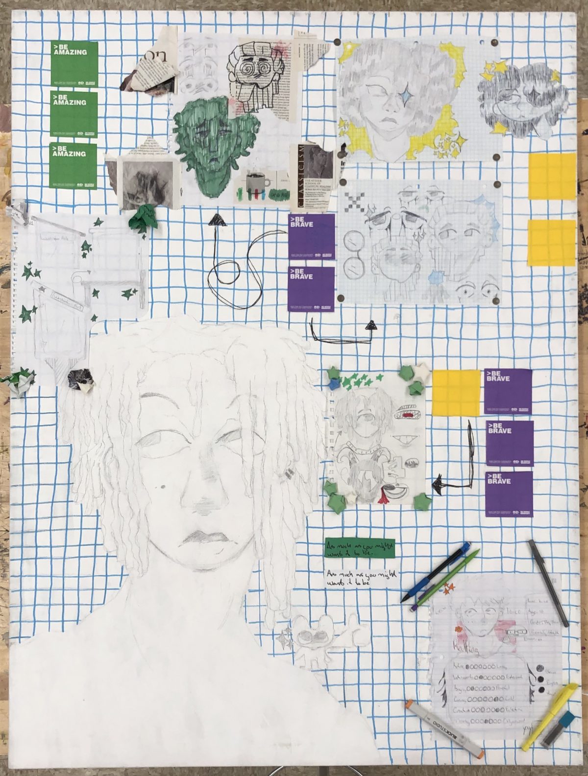Artist Statement: Inspired by “Bombardment” by Philip Guston, I incorporated two main elements. The perspective and the mood of the work. I wanted to create a sense of desperation from the model’s facial expression. Unlike Guston’s portrayal of civilians during the Spanish War; I show a man vs.self scenario, a war within themselves. The background provides an emphasis on the fish-eye perspective and the disarray of one’s mental state when placed in this position. The red symbolizes transparency between dimensions.