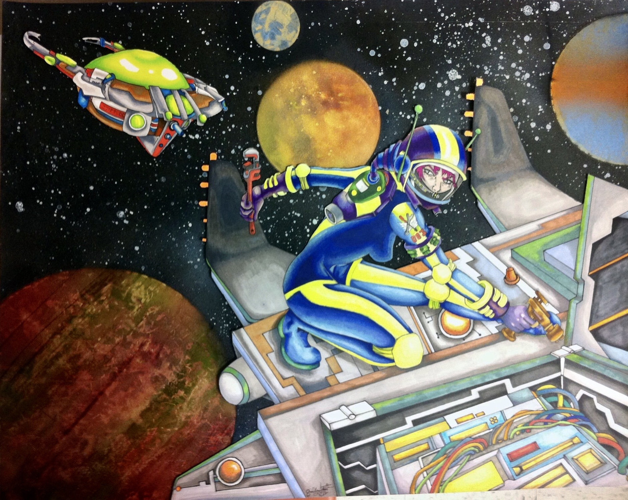 In Multitasking we see a young mechanic heroically fixing her ship while keeping an eye out for potential hijackers. Each piece in the series was created by hand using multiple artistic mediums and collaging techniques.