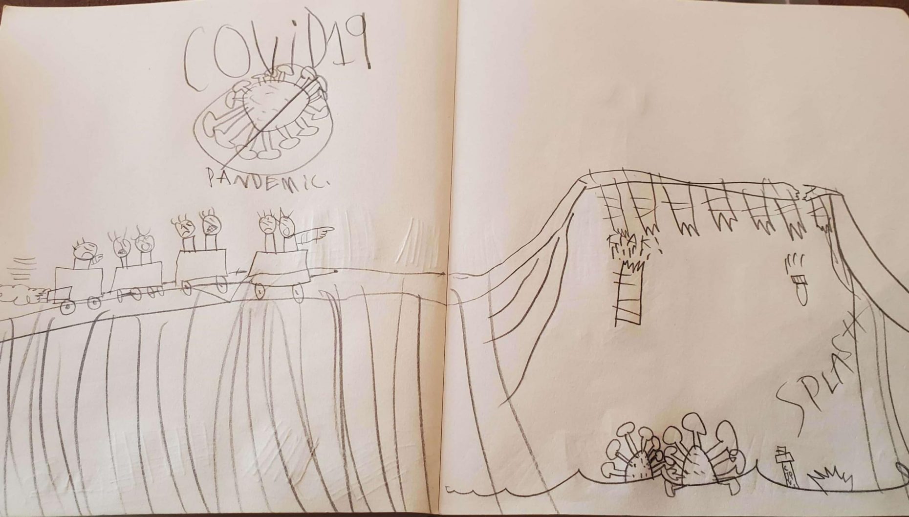 Artist Statement: The virus broke the bridge and the train has to stop so it doesn’t fall in.