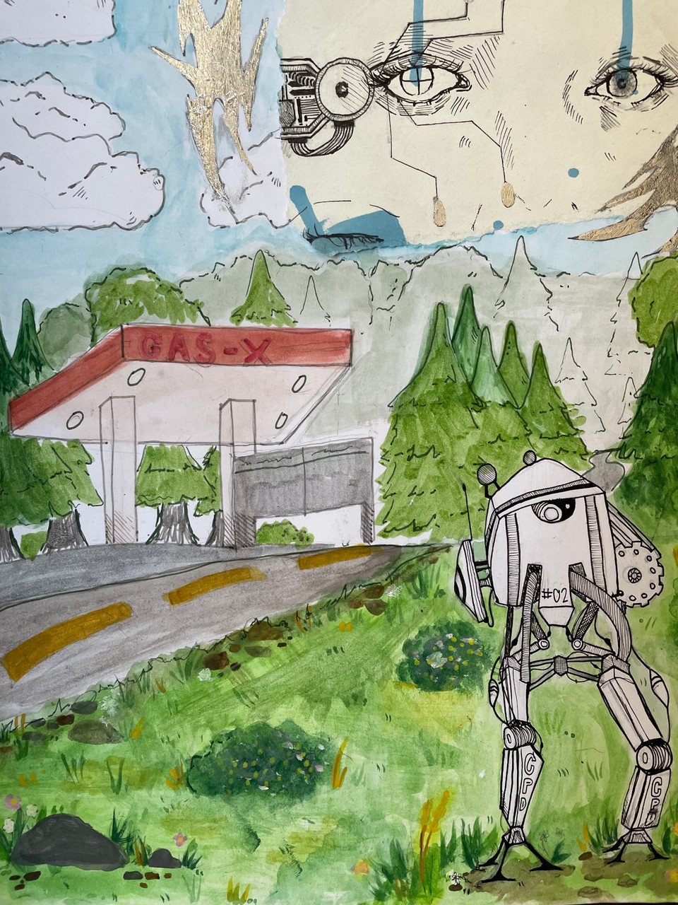 Description: “Paintings are… dominated by a sense of movement and action”(Charles M Russell) that creates this dramatic energy but in my work, there is a sense of calmness and mutual understanding between the Indian and Cowboy. Unlike Russell who created a movie within a single canvas, I thought to make my work reflect a photo from an encounter. The Cowboy occupies a small portion of the image because the Cowboy represents the new arrivals to the west from the east.
