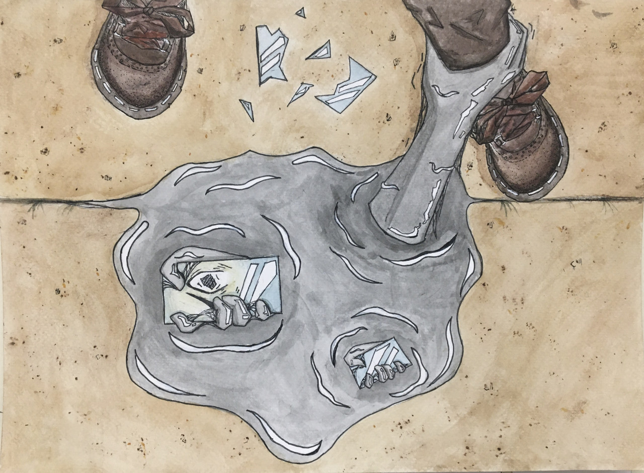 Artist Statement: I’m Amani Mohammad, a 16-year-old visual artist. I love to create art that shows emotions and experiences that not everyone can relate to but is still important to be educated about. This piece, made with watercolor pencils, is called “A Simple Reflection” and is based on a peer’s story, “A Simple Case”. The story takes place in a rainy area, where the main character is insecure about their face because it is too plain. They spend their life avoiding their reflection and they go outside, they hold their head down and hope the puddles on the sidewalk are muddy. I put my own twist to the story in an effort to make it connect with me more. I have what I believe to be facial dysmorphia, and almost always hide my face from myself and others. In this piece, I wanted to convey the feelings of panic and anxiety that I feel when I am forced to face my reflection or have others look under my mask. I want you to feel the emotions I felt while hiding my face, and eventually creating this piece.