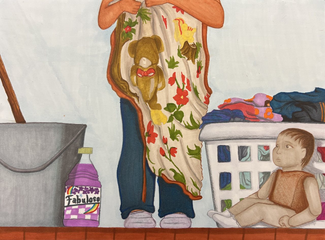 Description: My piece is based on the experience of being born a girl in Mexican culture, which traditionally means you’re responsible for cleaning and cooking, taking care of the kids and only being seen as future mothers and wives. This is because it is the standard that is put on girls at a young age and was inflicted on me when I was younger but I was not prepared for at such a young age. I used the blanket to show that it was a big part of my childhood since I even still have it now and cherish it since it was given to me by my grandpa and he did the same for my sister but I used this to symbolize an object that was my childhood and that I was gripping it to make sure that I didn’t let it go even when I was told to.