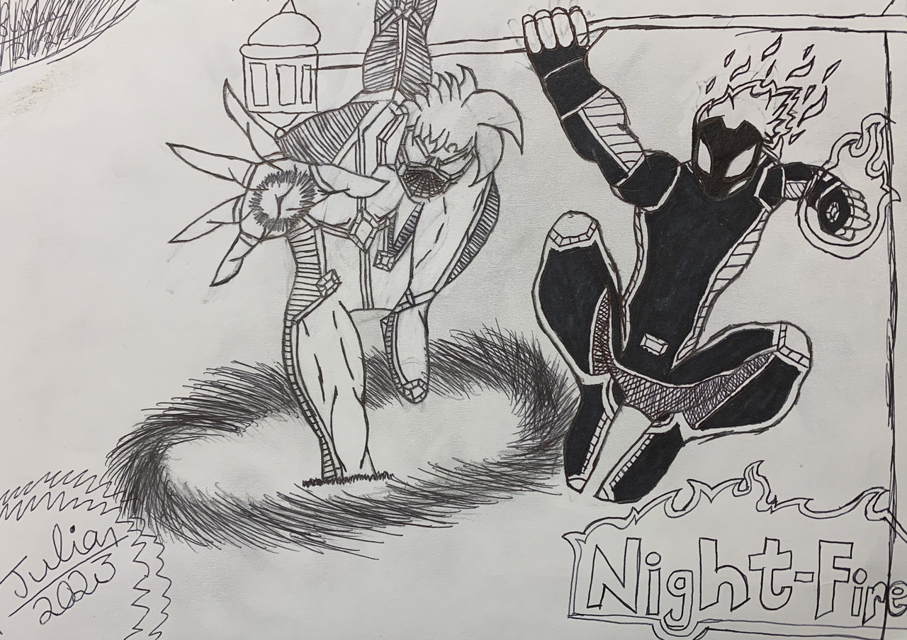 Description: Cosmic & Night-Fire’ are my very own character creations that I plan on using in my very own comic books one day. This was drawn using pen and marker.