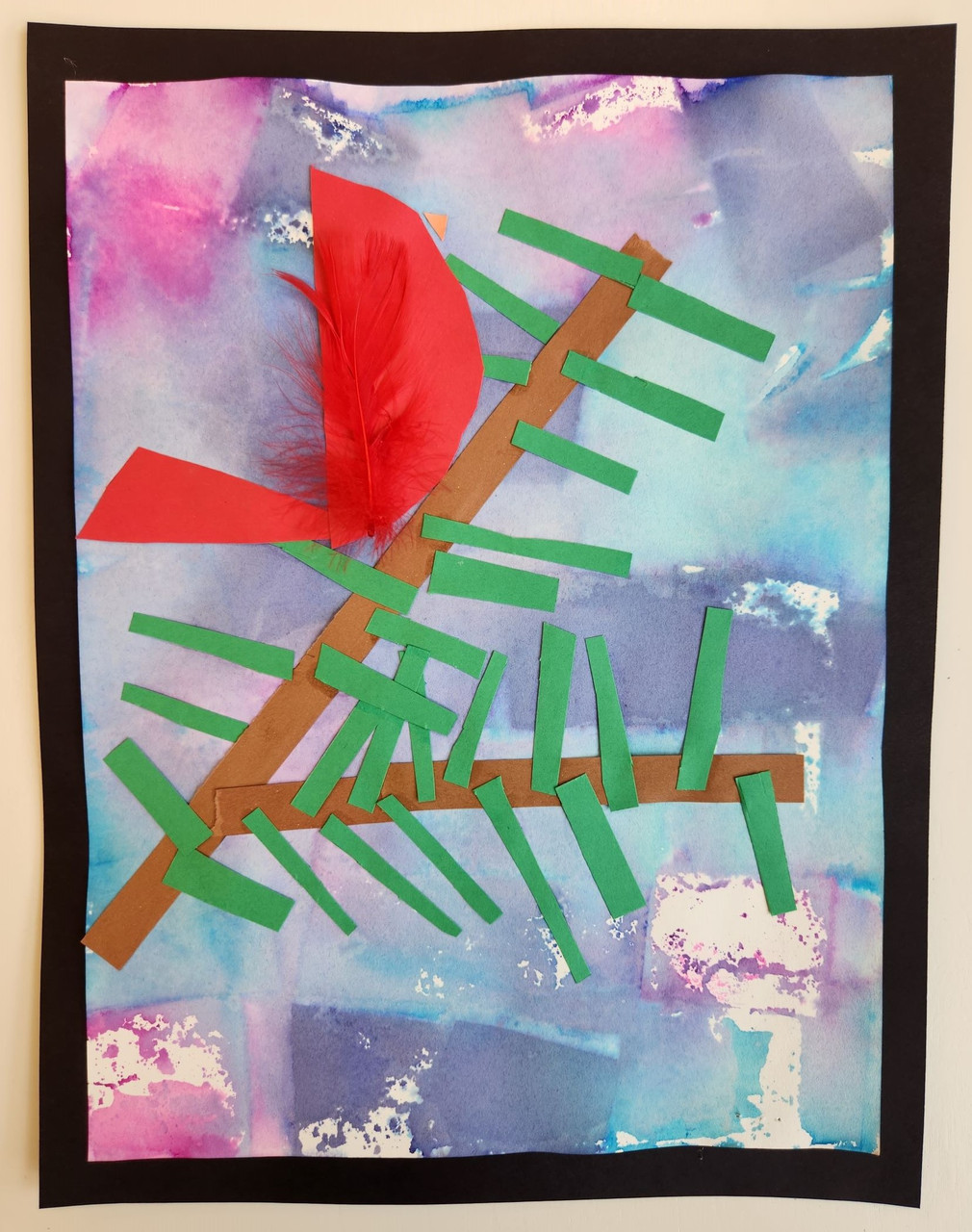 Description: We learned about how cardinals stay through the winter. We observed cardinals and made a collage of them. We also used tissue paper to bleed colors into our backgrounds then collaged on top.