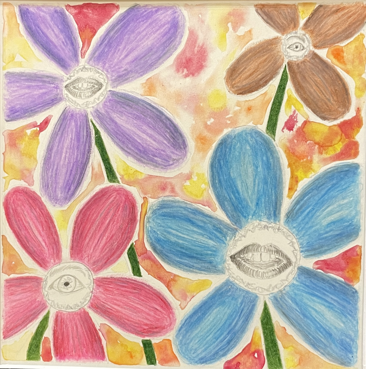 Description: Nature and the world around us has a big impact on how we grow as an individual. Warm colors in the background contrast with the vibrant colors used in the flowers. There is emphasis and unity created with the facial features drawn using graphite. The ways in which we see and interpret the world as we grow are affected by our personal experiences. Each person grows in different ways and speeds, hence the variety of flowers.
