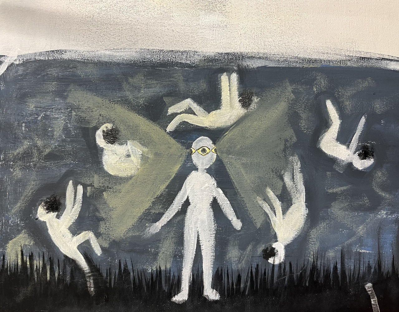 Description: The water is symbolizing how you can drown in your emotions, and there are many people there. There is a darkness at the bottom that holds on to you tightly if you get to that point. Most of the people are blinded by their own emotions, while the figure in the center is able to see, and recognizes that there are others in the water as well. The painting has an unfinished look to it, sort of showing the panic and tiredness that you can experience when you’ve fallen in the water. The outside of the water is white and pristine, as is the people. Just because the people are in the water, does not mean they are part of the water, or that they are bad people.