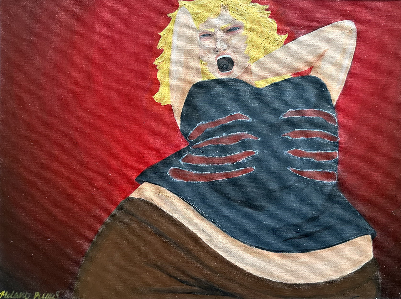 Description: Inspired by the desire for vengeance, I wanted to depict the process of it, particularly hatred. With that, the protagonist is frustrated and crying due to the amount of stress and lack of empathy for this individual she wants revenge on. Moreover, notice how the space around her encloses her, isolating her and the hatred. To emphasize her rage, I decided to evidently paint her ribs to symbolize her body heating up caused by her screaming.