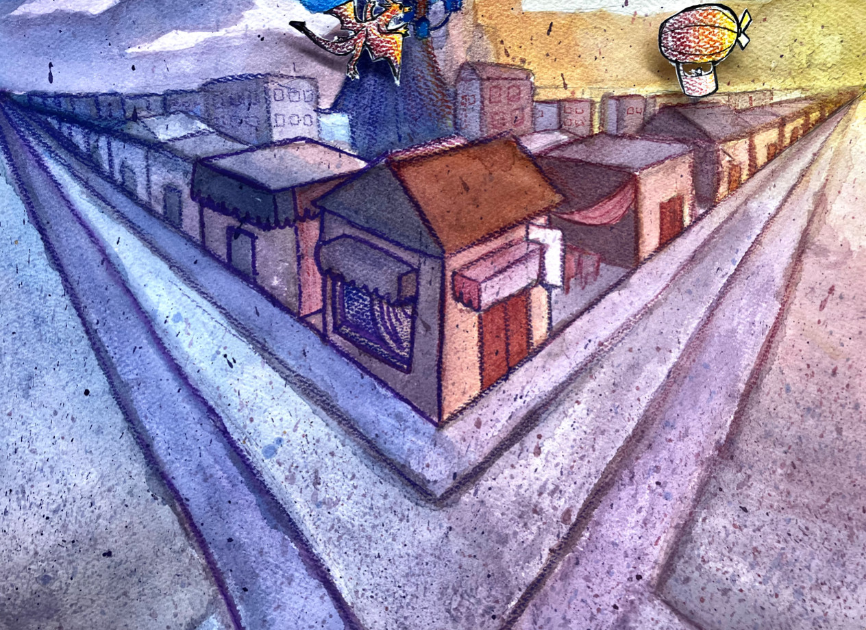 Artist Statement: The artwork that I have created for a perspective practice assignment, titled “Magical Sunset”, is a two point perspective view on a city-like setting. The canvas dimensions are 11 by 7 1/2 inches. The city is shaded with purple and blue colors and is highlighted with yellows to mimic a sunset coming from the right side of the piece. A dragon and a blimp are both present as 3d paper additions to the artwork. My piece uses watercolor paint as a base as well as colored pencils being used for lineart and details on the houses and buildings in the art piece. I used a lot of light values for the base colors of the city while using darker values of those same colors to give the piece defined lineart as well as shading coming from each edge of the 2 points of the perspective drawing.