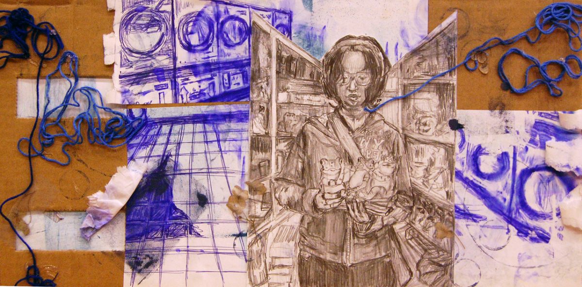 Artist Statement: A tile with an emphasis with sgraffito, which gives it the ‘block printing’ texture in the background and wings. Interpret it how you please!