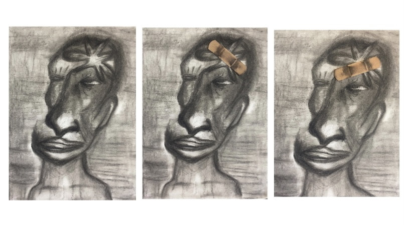Artist Statement: Manipulating Band-Aids into a charcoal drawing. Expressing feelings of migraines and aura chaos. Band-Aid covers up the pain but doesn’t stop it; false healing.