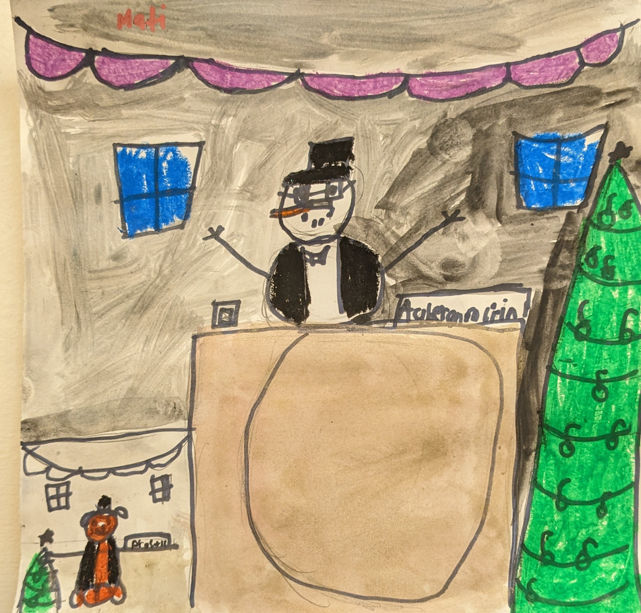 Description: Created with an integrated lesson between Library and Visual Arts – students read books about snowmen and created artwork inspired by the books.