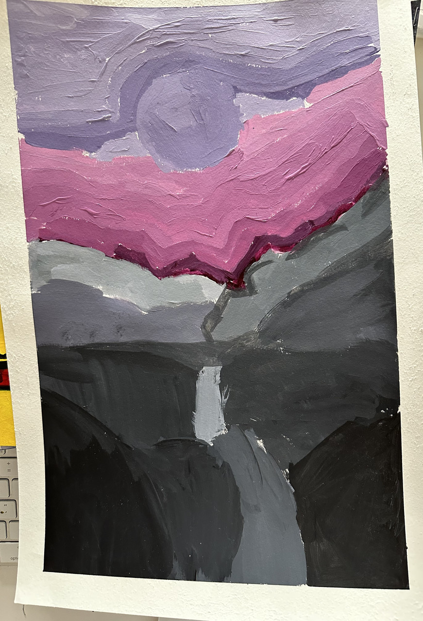 I originally picked a reference for this painting based on the interesting and colorful lighting. I already knew that I wanted to experiment more with the style of my work, so I used a palette knife to lay down definite strokes of colors. The process of painting this one was arduous yet rewarding; I had never painted in such bright colors in such a carefree and non-definite way.