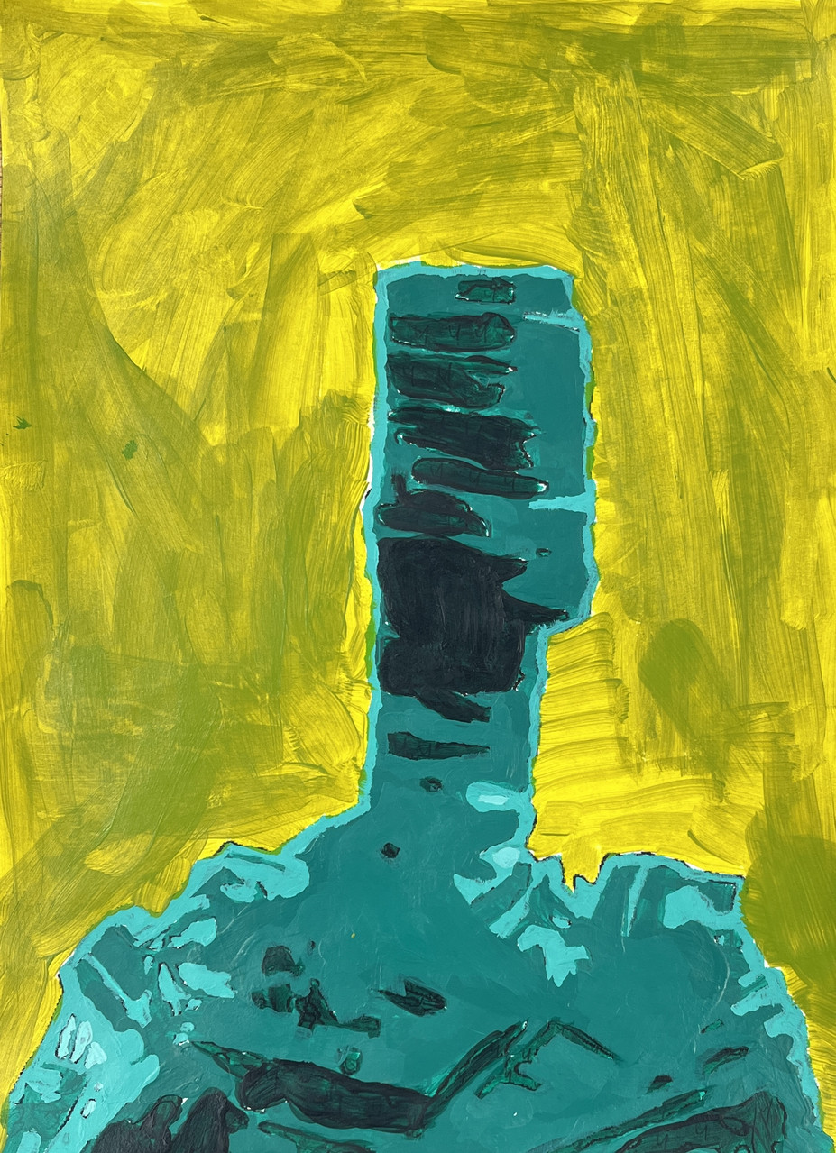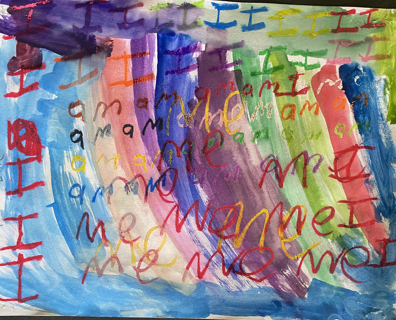 Description: “Positive affirmation resists” inspired by the work of Tarik Echols. Students experimented with repetition and layering of text that read encouraging messages and then painted bright watercolors on top.