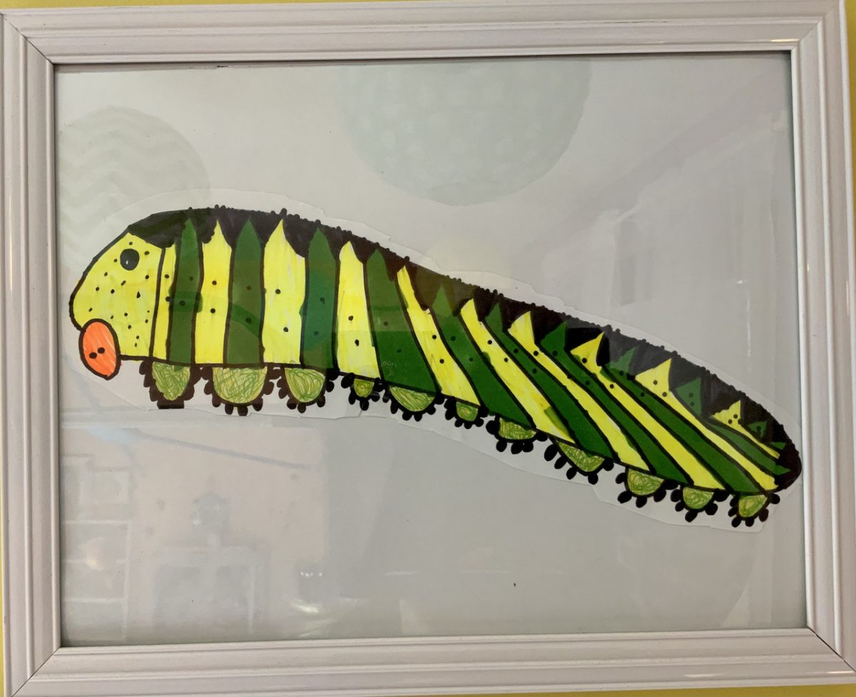 Derrick G. created his work from an assignment that started out as a drawing for Pokemon characters. He veered away from those characters and chose to use an evolved Sonic The Hedgehog of his own designs. He started with a ‘Smiley Face’ off-center page, then expounded on the work of his art. He likes using crayons to complete most of his drawings. He takes his time and seems to think about it through drawing on top of his doodles.
