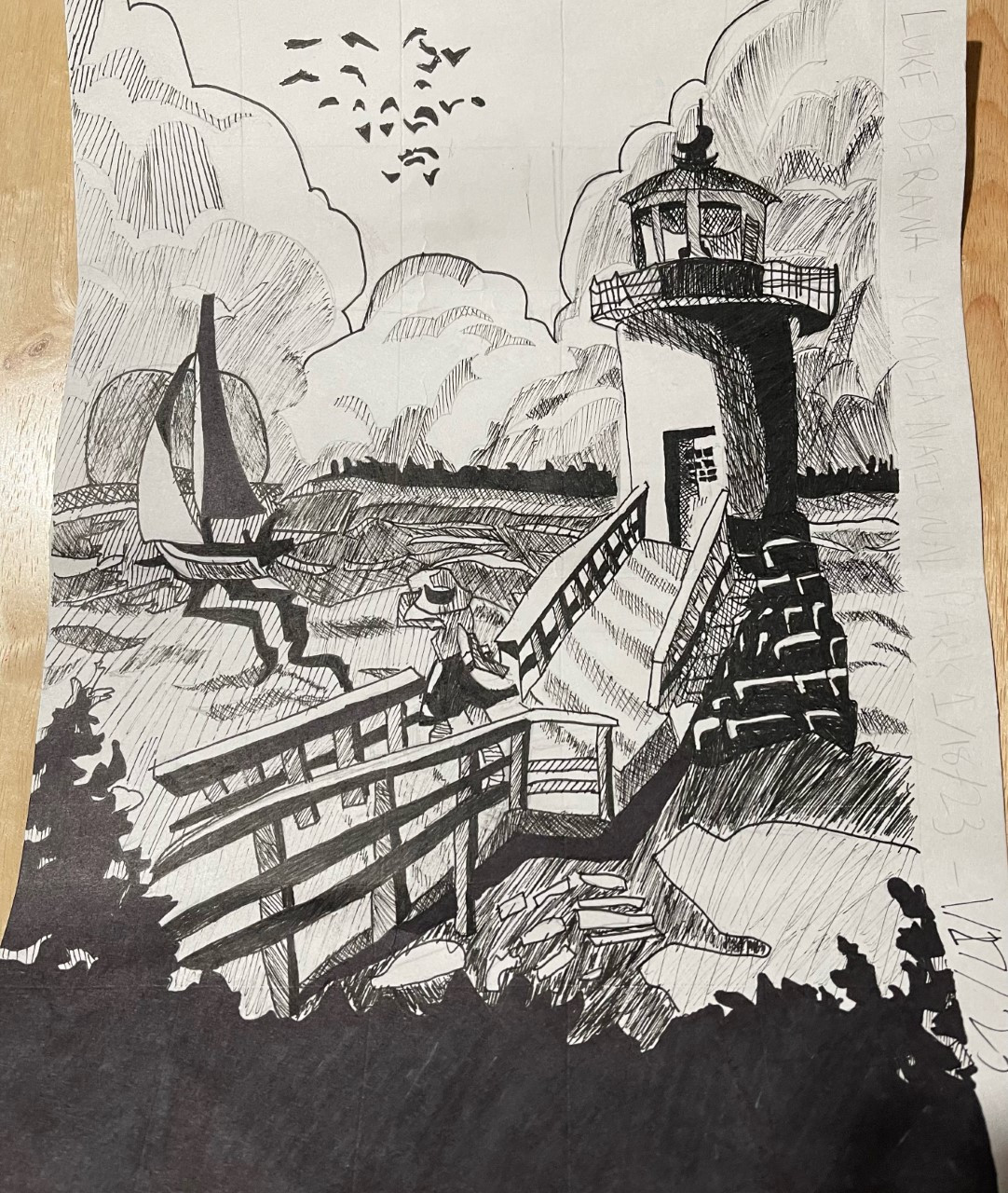 Artist Statement: This is a drawing of my childhood stuffed animal, Lovey. My sister is holding the bear and I’m holding her hands in the background. It’s made to feel like I’m passing my stuffed animal and with it, my childhood, down to my younger sister.