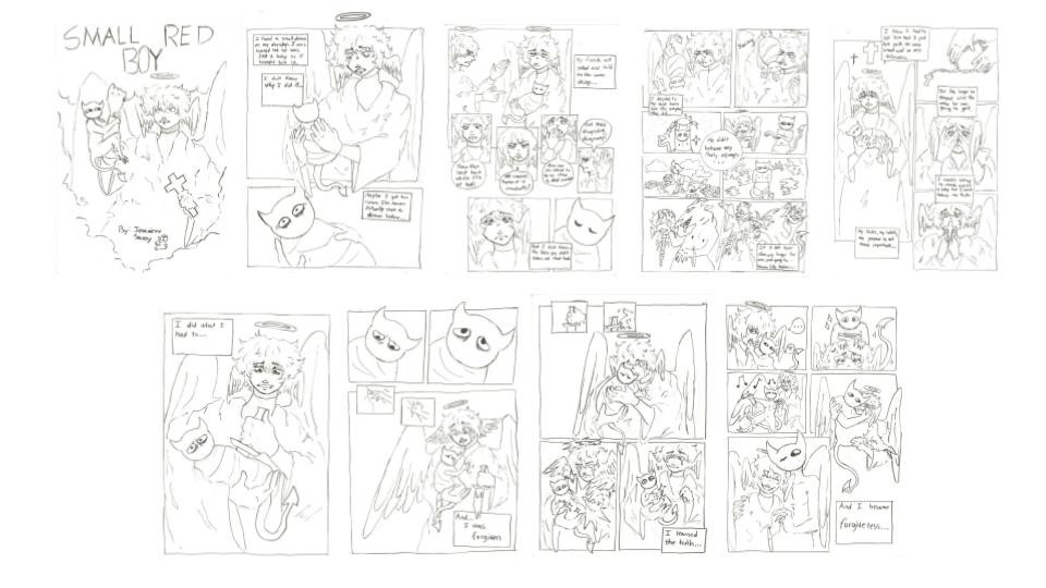 Artist Statement: Small Red Boy was named after and inspired by a song by AJJ. I’ve made multiple art pieces that were motivated by this song and the different interpretations I have gotten out of it. This specific comic can have any interpretation from overcoming religious guilt, accepting others for who they are, or it can be as simple as a soft story about an unlikely family. Whichever meaning people get out of this piece, it can be the right one. Any meaning that resonates with you is correct.