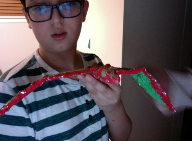 this is my flying dragon it took a surprising 3 hours to complete from outside it is just tinfoil and paint but there is a very important baser made of wood sticks for the wings to make them actually flappable it was really hard so please enjoy