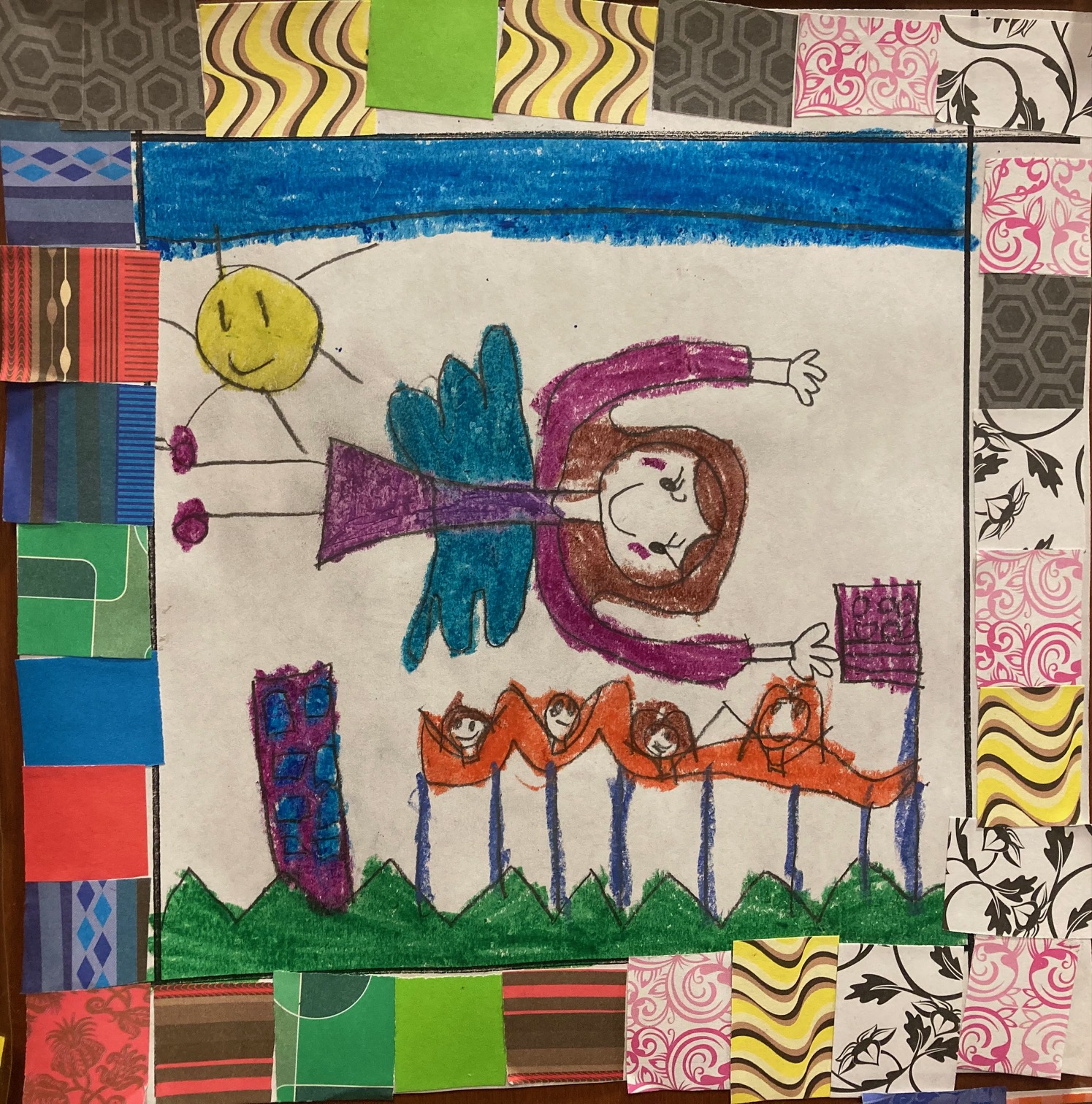 Materials: Collage of pattern paper, crayon, pencil and marker