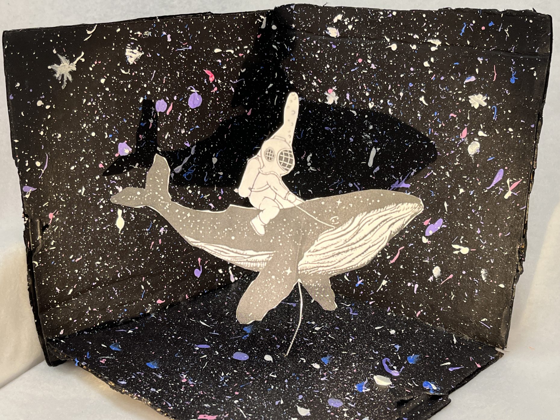 A diorama of an astronaut riding on the back of a whale through splatter paint space.