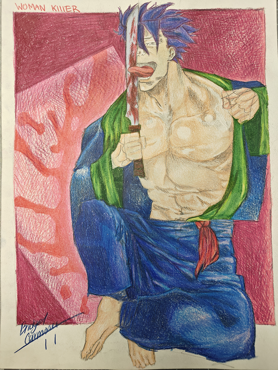 A figure sits in front of a vibrant background licking their sword.