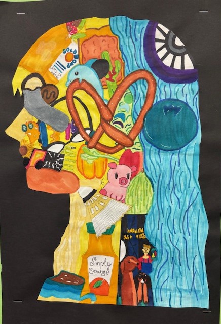 This piece is of my mom and her thought process. The art depicts her interests, favorite foods, and hobbies.