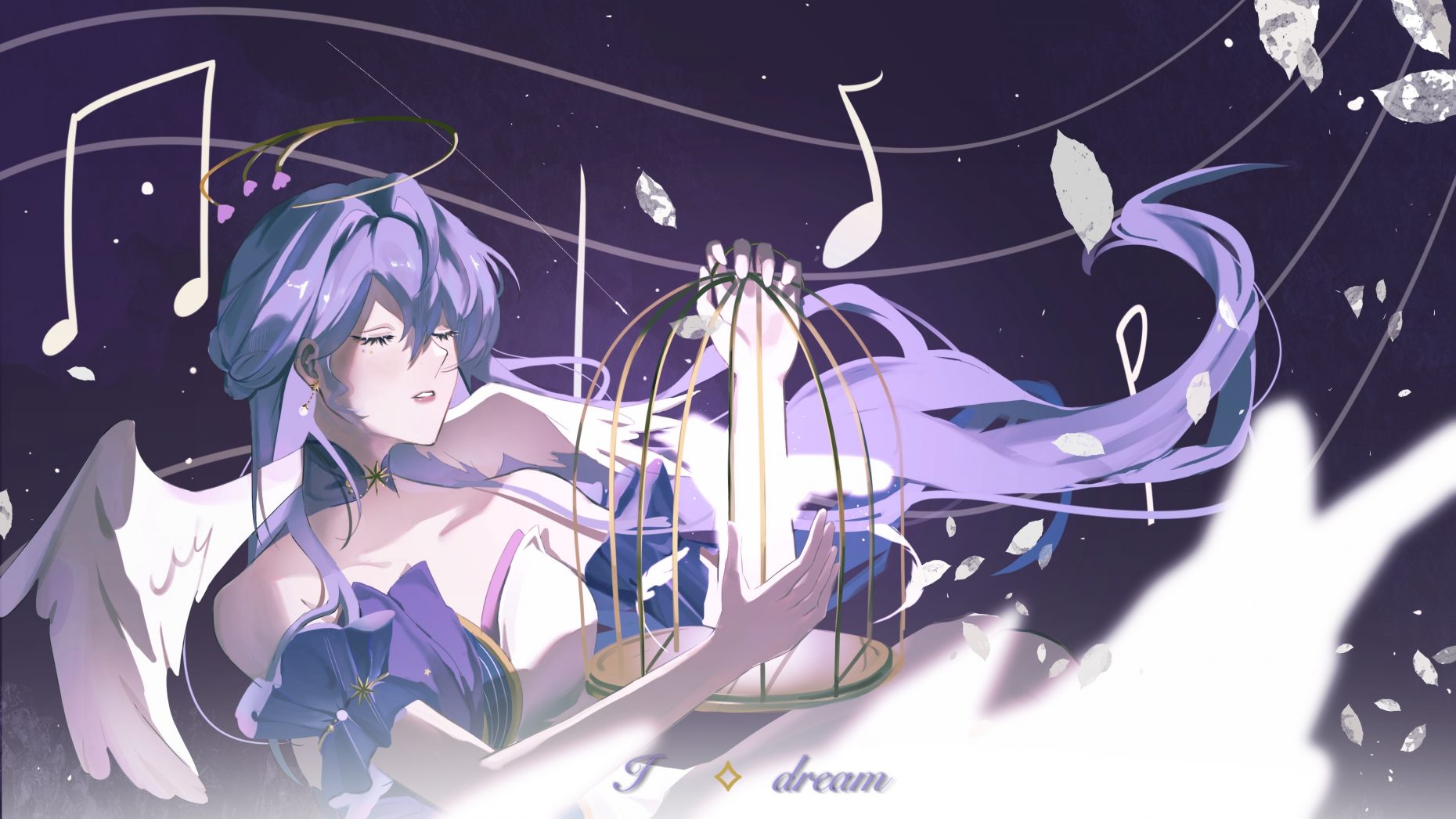Just like a trapped bird in a cage, one can not freely express the way they feel. Elements of this artwork comes from a song sung by a character named Robin in a game called Honkai Star Rail, “If I Can’t Stop One Heart From Breaking”. The lyrics are presented with wings spreading bravely, white petals blowing away, and trapped in a cage. I dream for a universe like this.