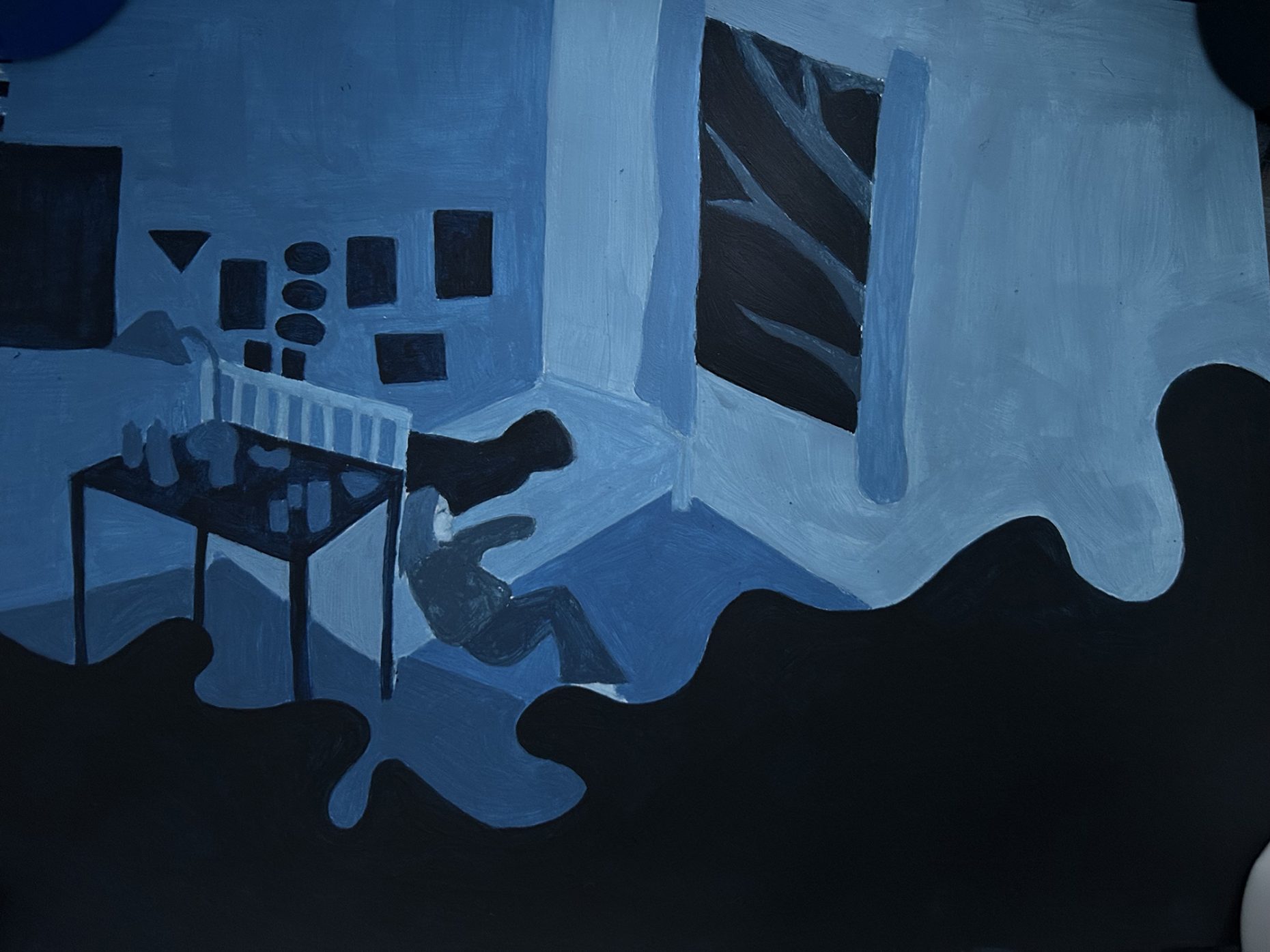 I was trying to convey feelings of grief or loss, in which the person in the painting is unfocused in their environment and is somewhat dissociated from reality.