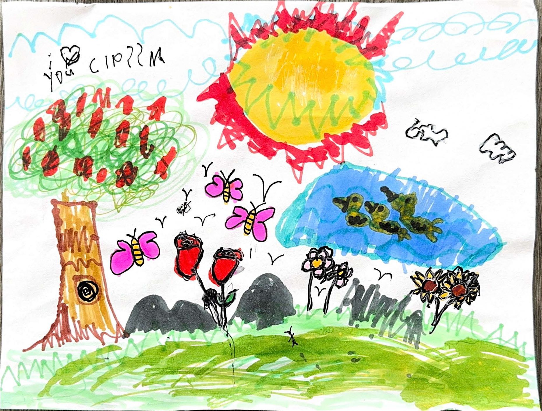 I’m Eli Garland and I’m 5 1/2 years old. I like to draw and paint pictures with a mixture of crayons, markers, gel crayons and tempera paint and tempera paint crayons. Some themes that I like to draw are planets, rainbows, plants and people.