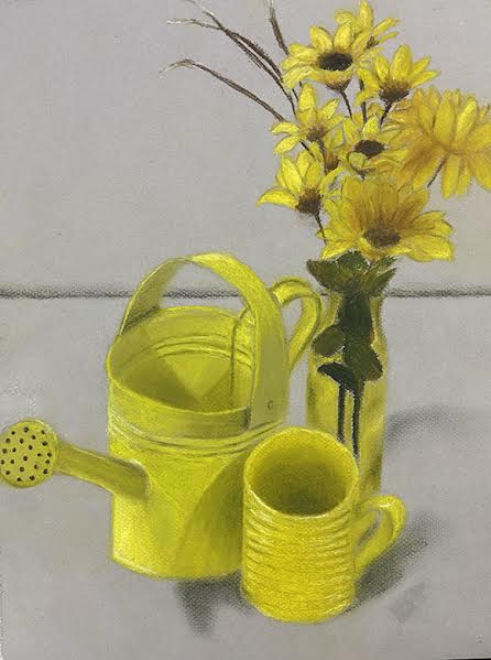 Monochromatic still life, referencing three yellow objects provided by the teacher, arranged into one frame using the rule of thirds of photography. This was drawn using yellow oil pastel, using black, white, and neighboring colors to provide shading and highlights.