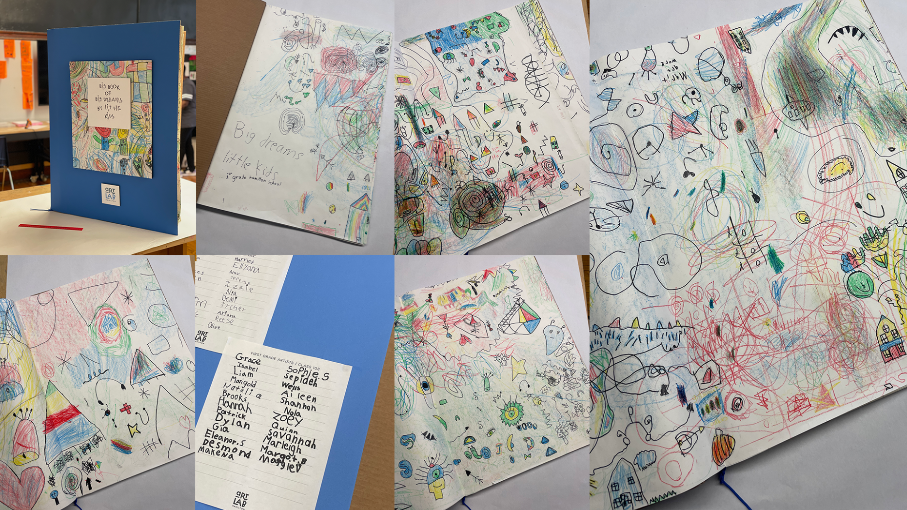 Inspired by Miró, the 1st Graders created The Big Book of Big Dreams by Little People, a large-scale collaborative drawing using rolls of paper, crayons, and sharpies. They explored playful shapes and vibrant abstract forms, translating their dreams into expressive compositions.