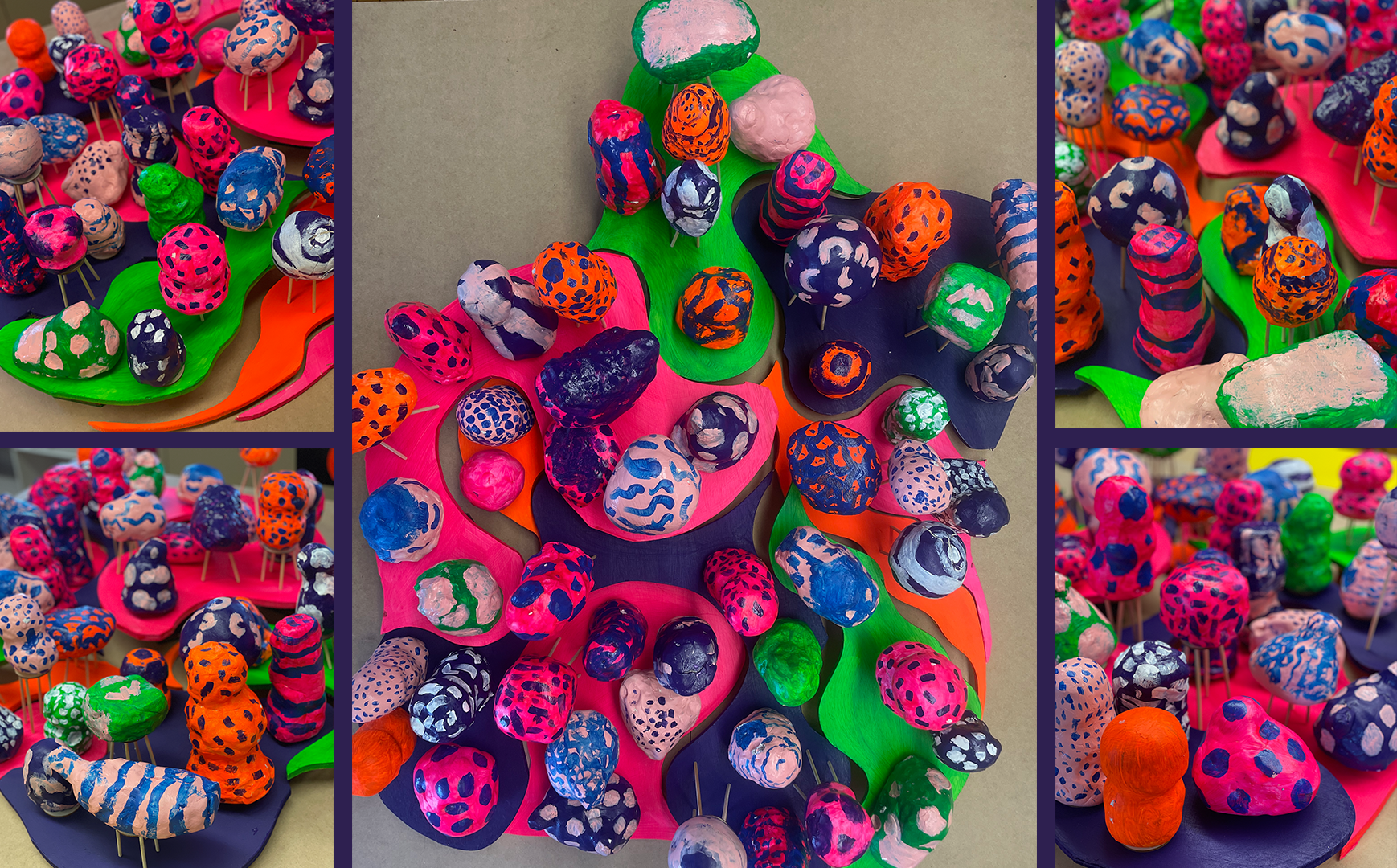 Drawing from Yayoi Kusama’s work, students experimented with bold two-color compositions and sculptural forms. Using air-dry clay and acrylic paint, they brought their Dreamscape Creatures to life — each uniquely named by its creator. The school carpentry team helped build the bases for these imaginative sculptures.