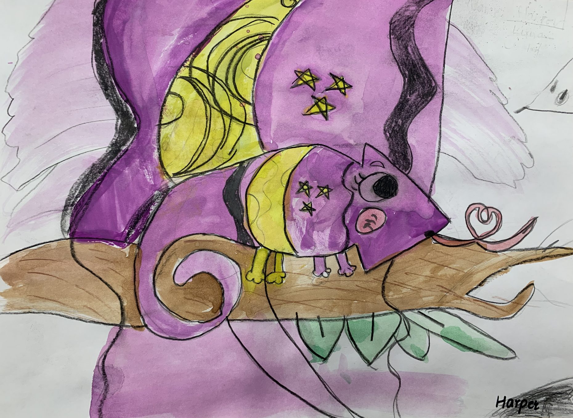 My purple chameleon is camouflaged in front of the purple and yellow background. Her tongue created a heart swirl.
