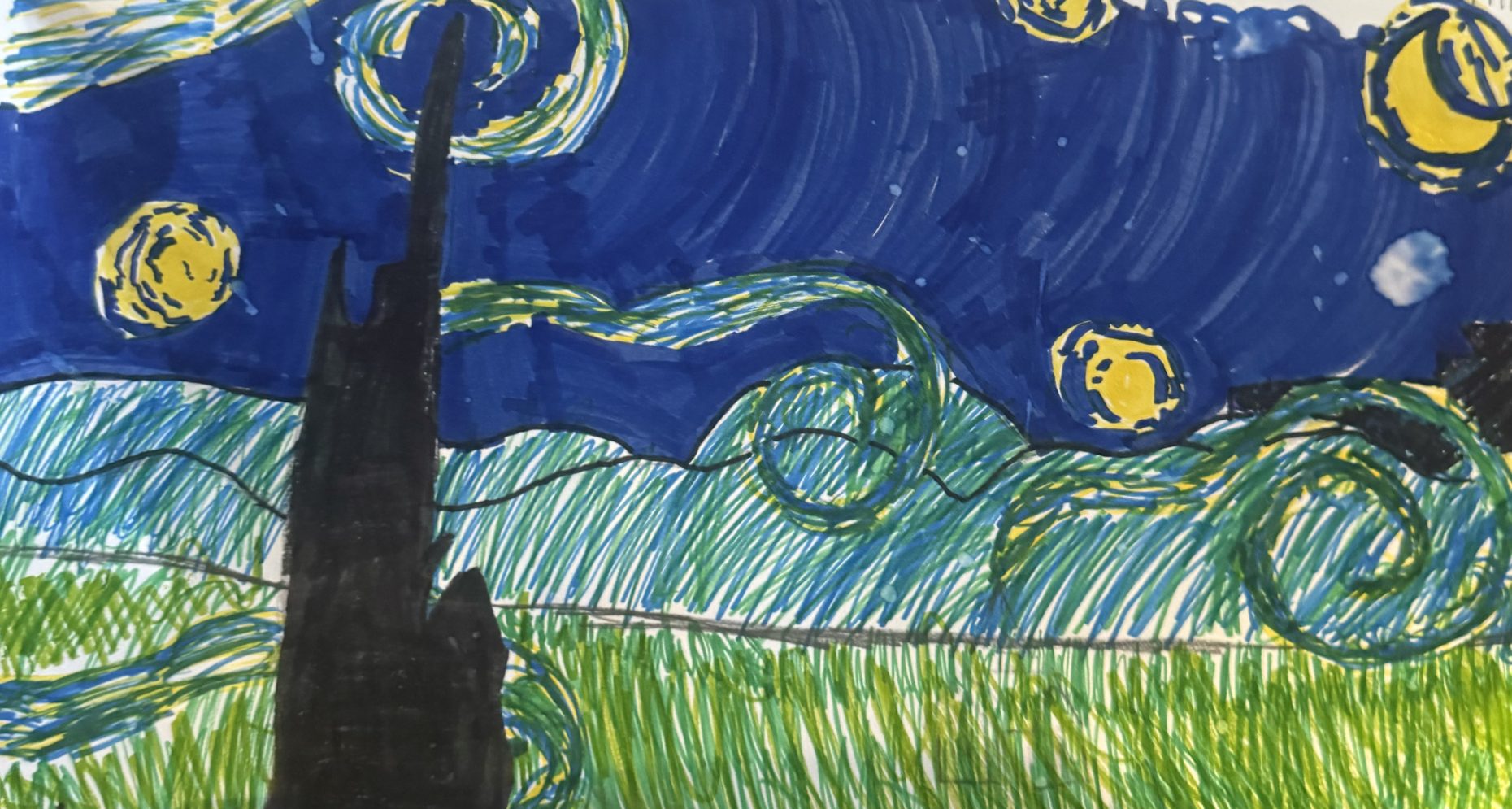 A drawing I made in Art class inspired by Van Gogh’s, “The Starry Night.”