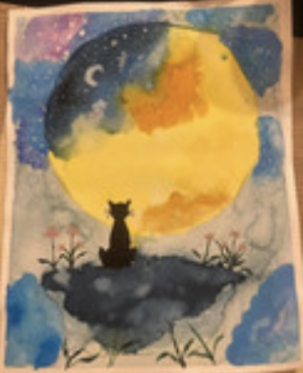 In this painting, I wanted to capture a moment where everything feels possible. The big, bright moon represents dreams—like the ones I have when I think about the future. The cat, sitting quietly, is like me—curious and sometimes a little shy.