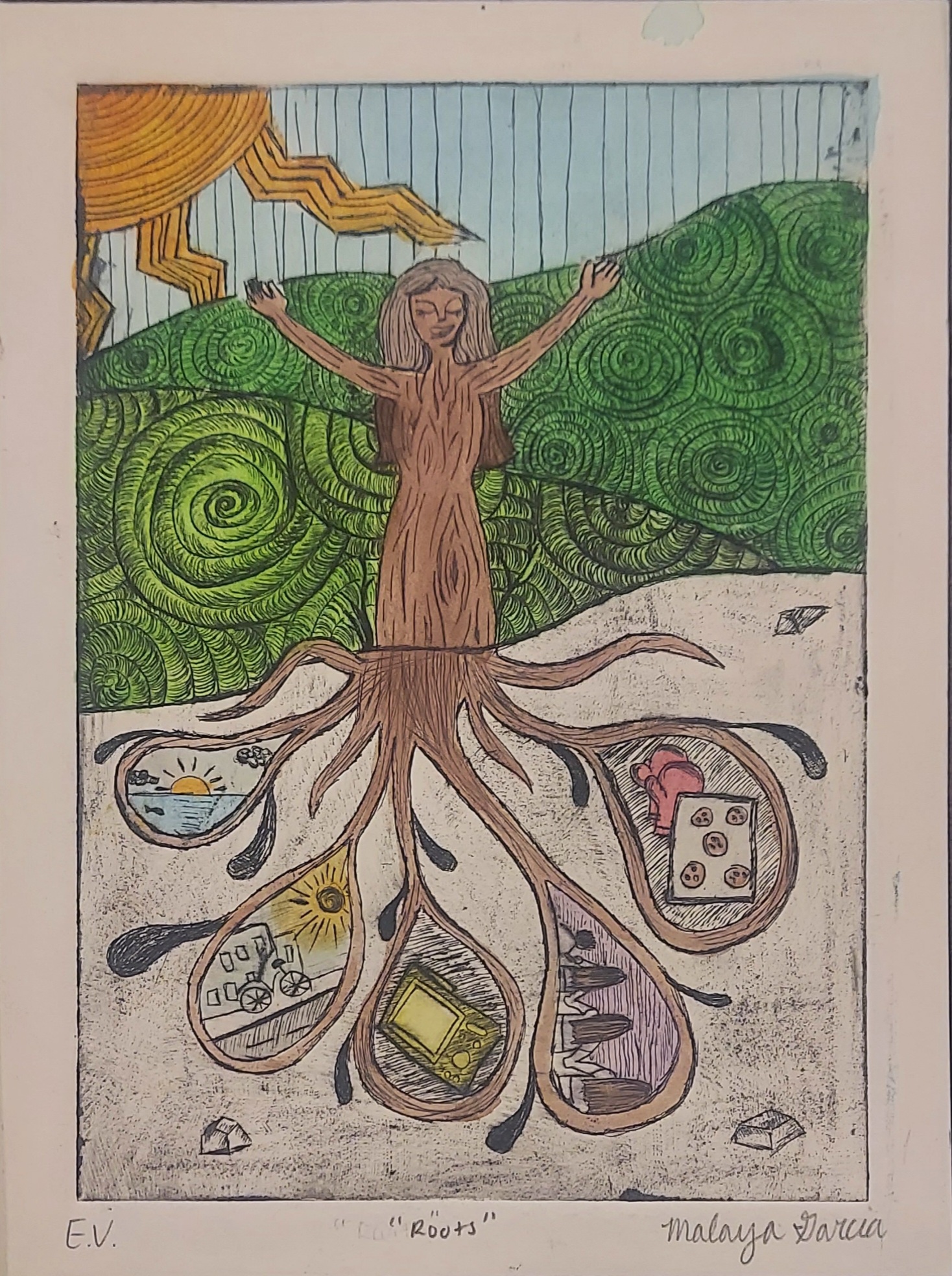 “Roots” is a drypoint print that reflects memory and its great influence on personal growth. Each ‘root’ is one of my core memories, symbolizing how these moments have shaped an nurtured who I am today.