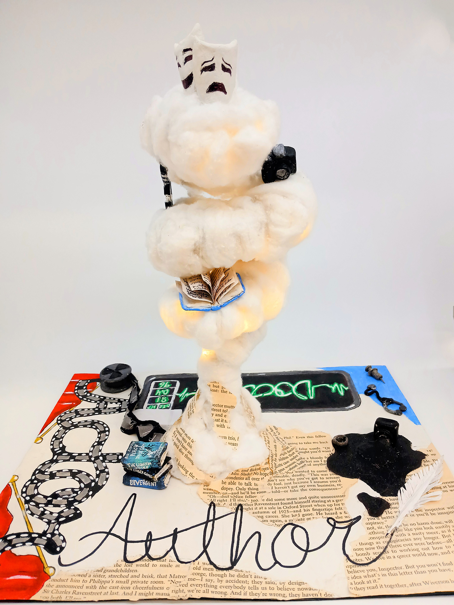 “Dream-nado” is a piece of art that symbolizes the whirlwind of aspirations and the turbulent journey of dreams and aspirations. This artwork models the dreams of becoming an Actor, Doctor, and Author, all caught in a swirling storm. Scattered across the ground are broken book pages, ink splatters, a stethoscope, a syringe, and film tape, each representing the fragmented remnants of these dreams. The chaotic motion and dispersed elements show the struggle and determination required to chase one’s aspirations, reflecting the stormy yet exhilarating path of pursuing your’s passions.