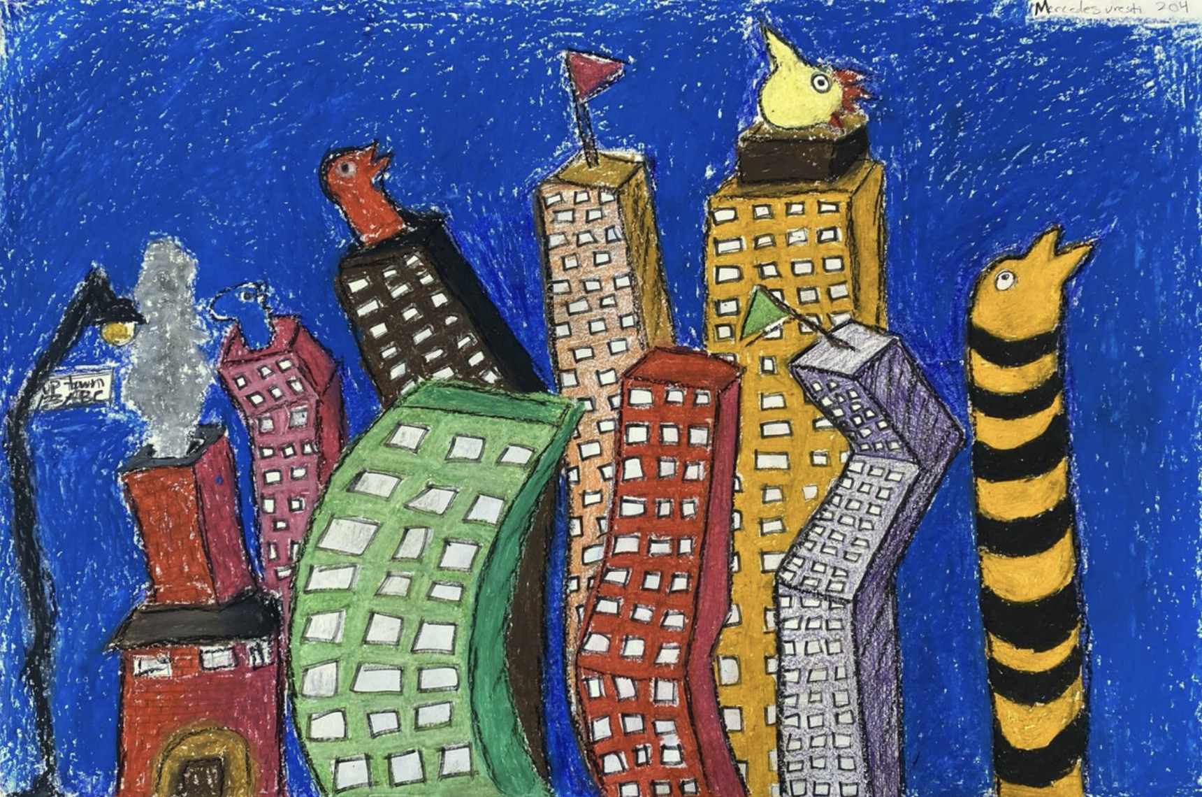 My artwork is supposed to be is a tilted building around in a city, along with different birds on top of the building, also with different colored flags. What had inspired me to create my art was when I was younger, my grandmother had me and my sisters watch a show called “Sesame Street.” One of my main favorite characters was Big Bird. I loved how his feathers were a bright yellow, how he himself was big but also seemed fluffy. Around that time, I loved going outside and being out in nature just to see all the different types of birds either in my backyard, front yard or around my neighborhood. Another thing that had inspired me was when I was starting an art project, I had searched up things you would not normally see on a daily basis or this time of day. I had then come across an art piece where the buildings were slanted and the lanterns sign had “Up Town” on it.
