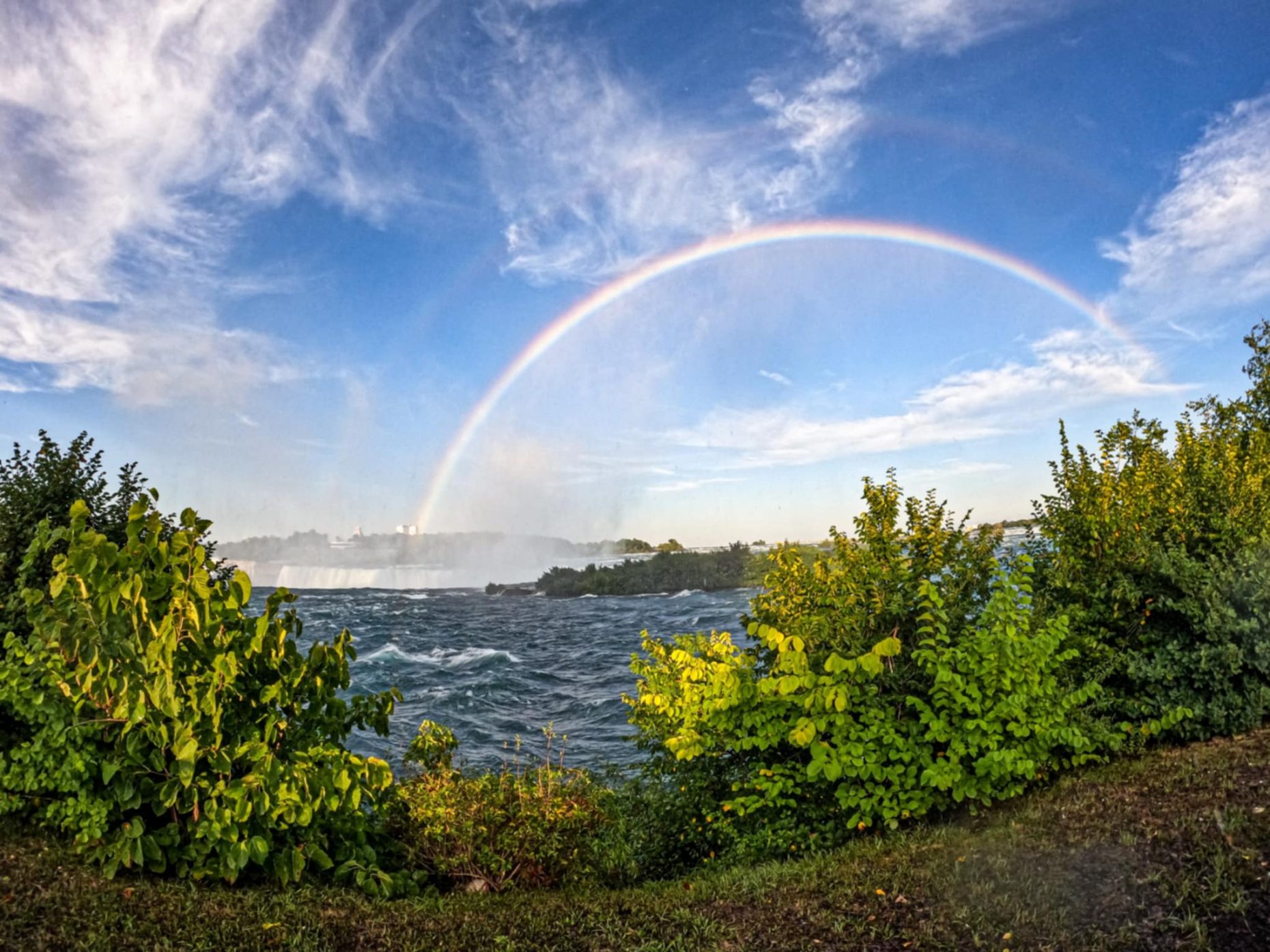 A double-bow rainbow dances on the water at Niagara Falls, Ontario, Canada.