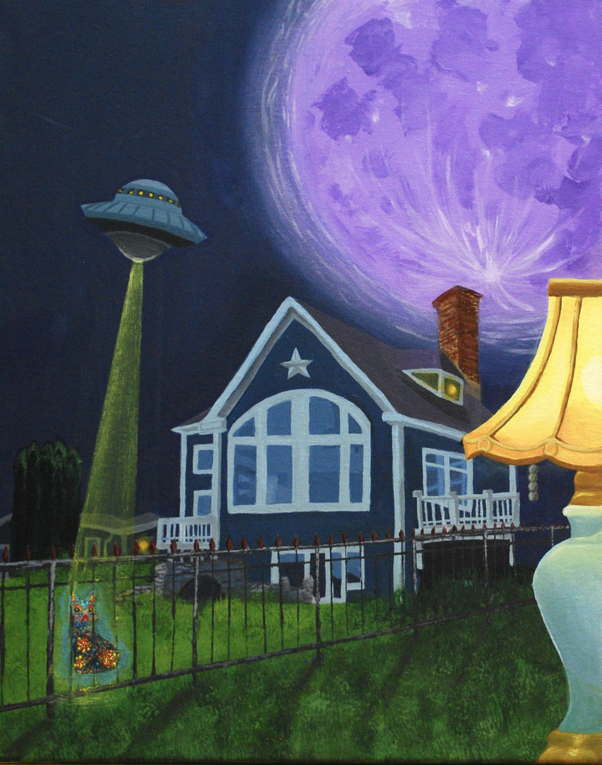 An acrylic surrealist painting that highlights the contrast between a conventional American suburban home with an otherworldly “invader.” Through the juxtaposition of ordinary suburbia and fantastical aliens, this painting aims to make the strange familiar and the familiar strange. The blue and red house, adorned with a white star, represents the American ideal. The fence, which draws a sharp barrier between the normalcy of society and the foreign darkness beyond, is broken by the foreign entities inside it next to the American home whilst a simple lamp illuminates the darkness outside of it. This painting reflects the confusing and isolating experience of alienation, and growing up feeling like an outsider trying to conform to mainstream society.