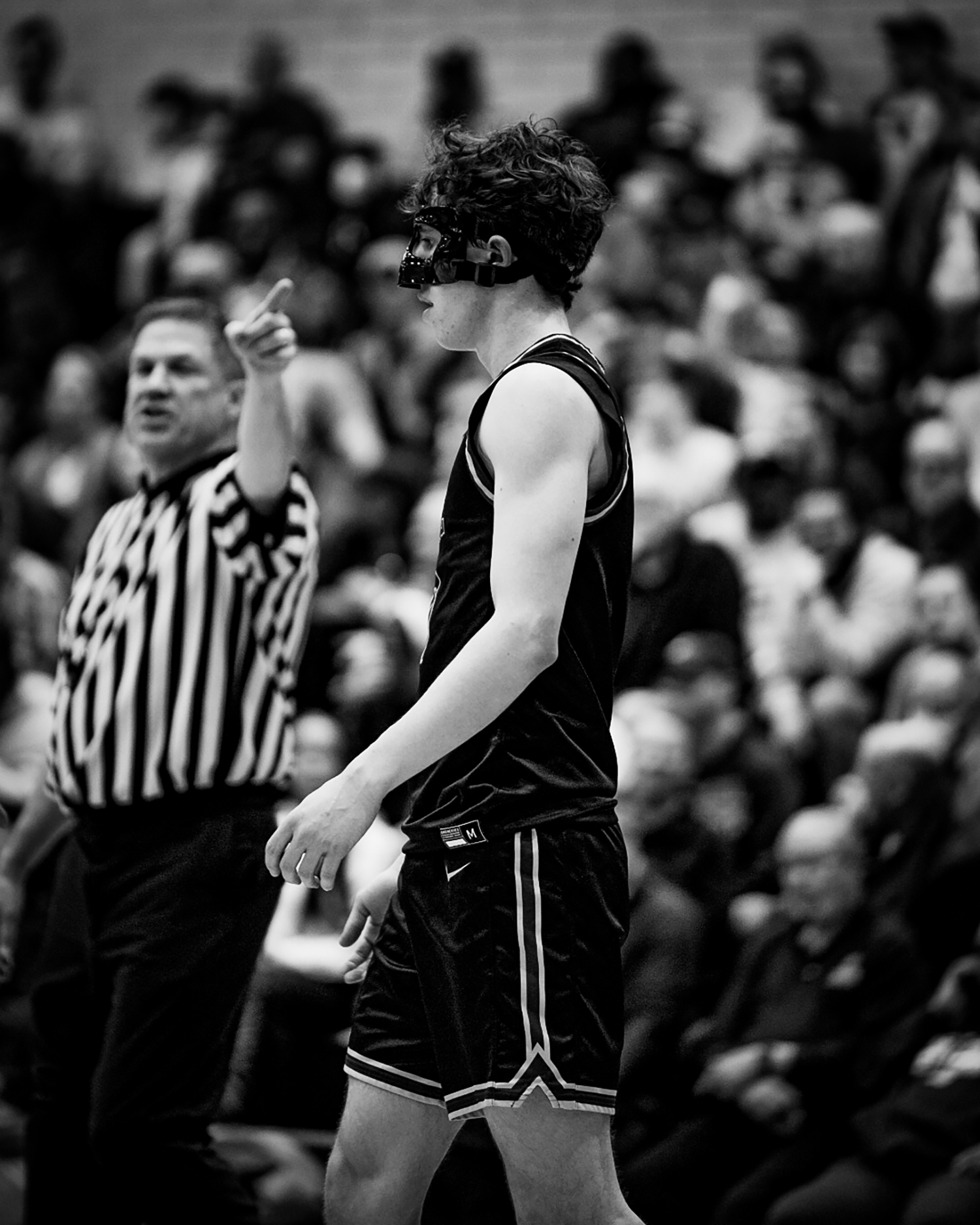 This black-and-white photograph captures resilience in the heat of competition. The masked athlete stands focused as the referee signals, highlighting a moment of tension and control. Stripped of color, the image emphasizes contrast, movement, and emotion—telling a story of perseverance beyond the game itself.