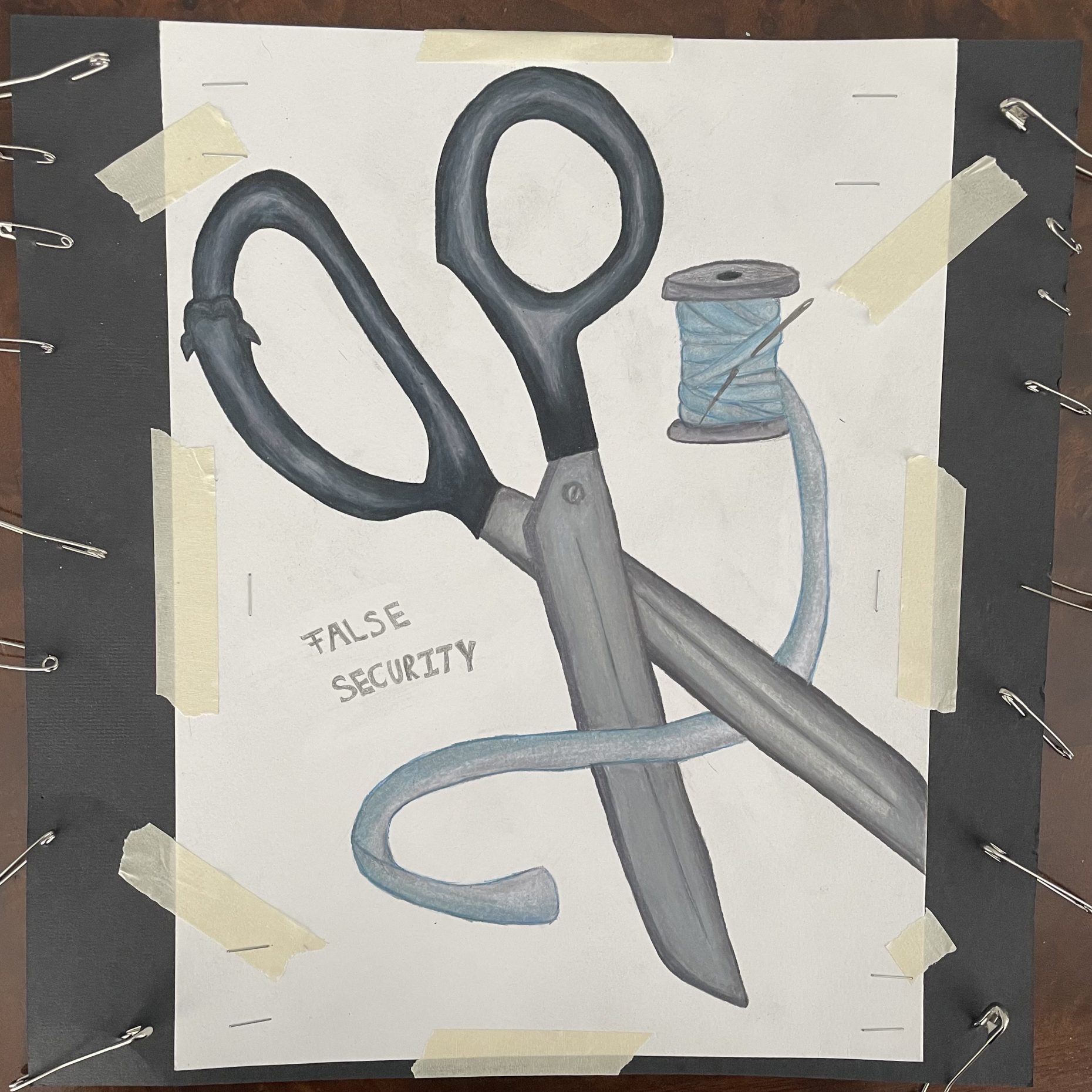 My piece consists of a color pencil drawing of a pair of scissors. Surrounding the scissors, there are staples stapled into the paper and tape taped down onto the black background. The forms of adhesive and bonding methods are meant to physically represent the comfort in having emotional stability. I thought this was the perfect image to portray the feelings of pressure when discussing anxious attachment styles and the power of control. The idea of “holding everything together” is represented through the tape, staples, and pins. It portrays the act of attempting to prevent something from going astray but the scissors cutting the ribbon in the center contradicts all the bonding methods (staples, tape, and pins). The juxtaposition of the scissors and the pins, tape, and staples highlights the contrasting ideas of feeling secure and feeling broken.
