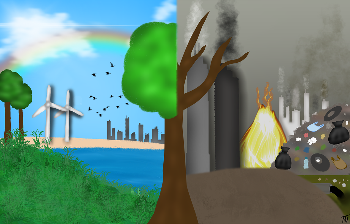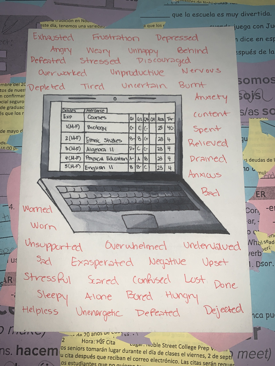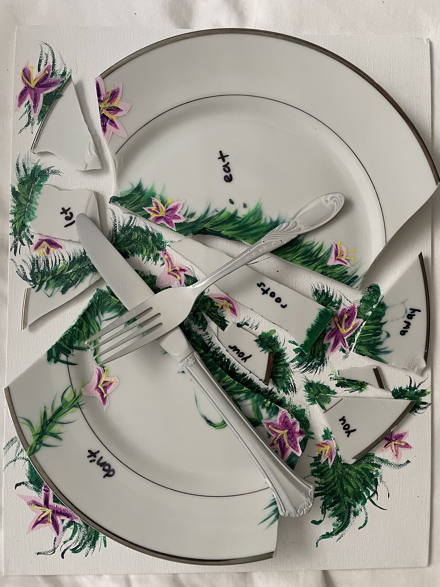My piece consists of a ceramic plate, steel utensils, and acrylic paintings. In order to develop this piece I had to break a ceramic plate into shards and spray paint my utensils white. Afterwards, I positioned my pieces on a canvas exactly where I wanted them. Then, I painted lily flowers and weeds in between the cracks and crevices of the shards. The lilies are a representation of growth and new beginnings that grow from something that is broken. Each shard contains a word, which contributes to the overall message of the piece. The shards read “Don’t let your roots eat you away”. The significance of this sentence emphasizes the theme of new beginnings and letting go of the past. These themes are represented by the juxtaposition of the broken plate and fresh growing flowers. The fork and knife further represent the idea of getting eaten away by the past.
